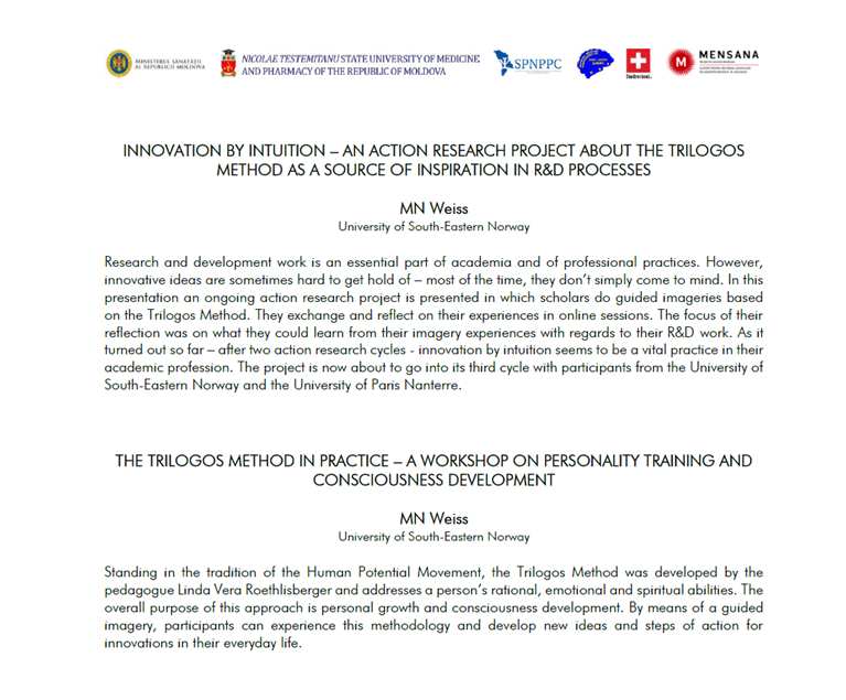 Beigefügte Präsentationsunterlagen INNOVATION THROUGH INNOVATION zeigen, welchen Nutzen die 4 WissenschaftlerInnen seit 2023 aus der angewandten Trilogos Methode im Hinblick auf Ihr Privat- und Berufsleben ziehen konnten.